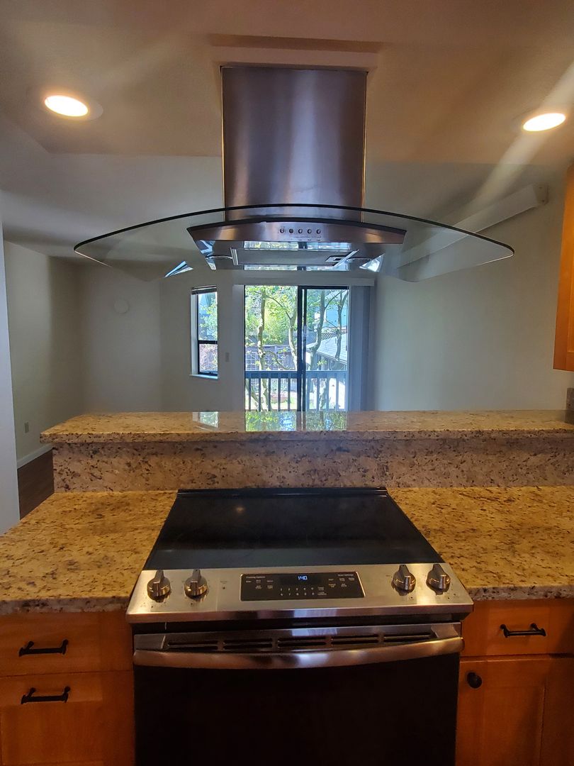 The open-concept first floor features a remodeled kitchen with granite countertops, a glass cooktop stove / oven, a separate dining space, and with a west-facing deck. This unit features a bay window in the kitchen.