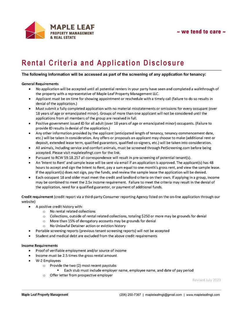 View our Rental Criteria and Application Disclosure at http://mapleleafmgt.com