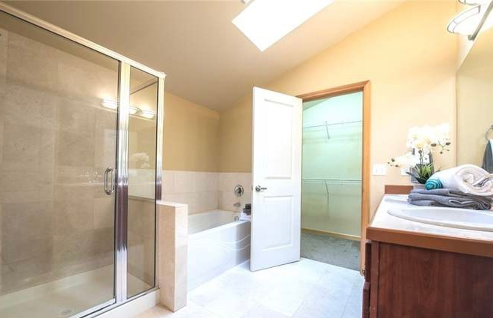Welcome to this incredible three bedroom, three and a half bath home in North Seattle! The expansive open concept main level has a living room, dining area, and kitchen with slab counters and stainless steel appliances. Upstairs you will enjoy two spacious primary bedrooms with en suites and vaulted ceilings. On the ground level you will find a third bedroom, bath, and a converted garage that can double as a media room, exercise space or storage. Street parking.