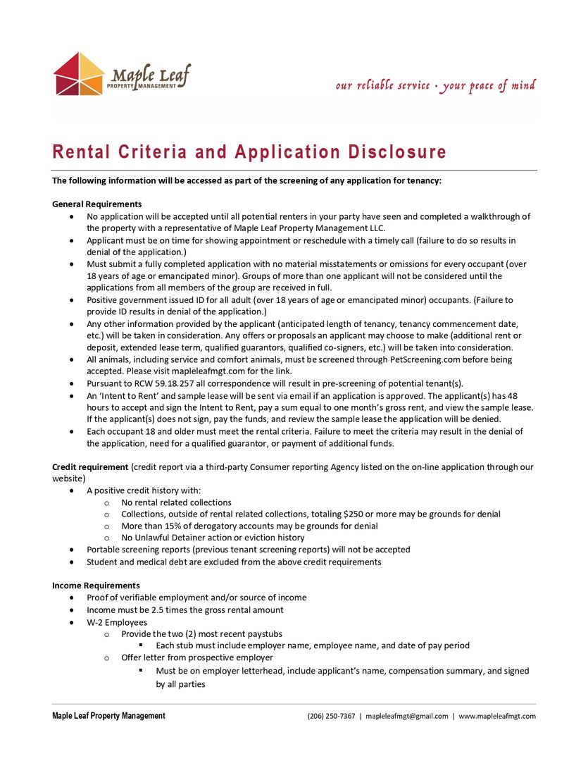 View our Rental Criteria and Application Disclosure at http://mapleleafmgt.com