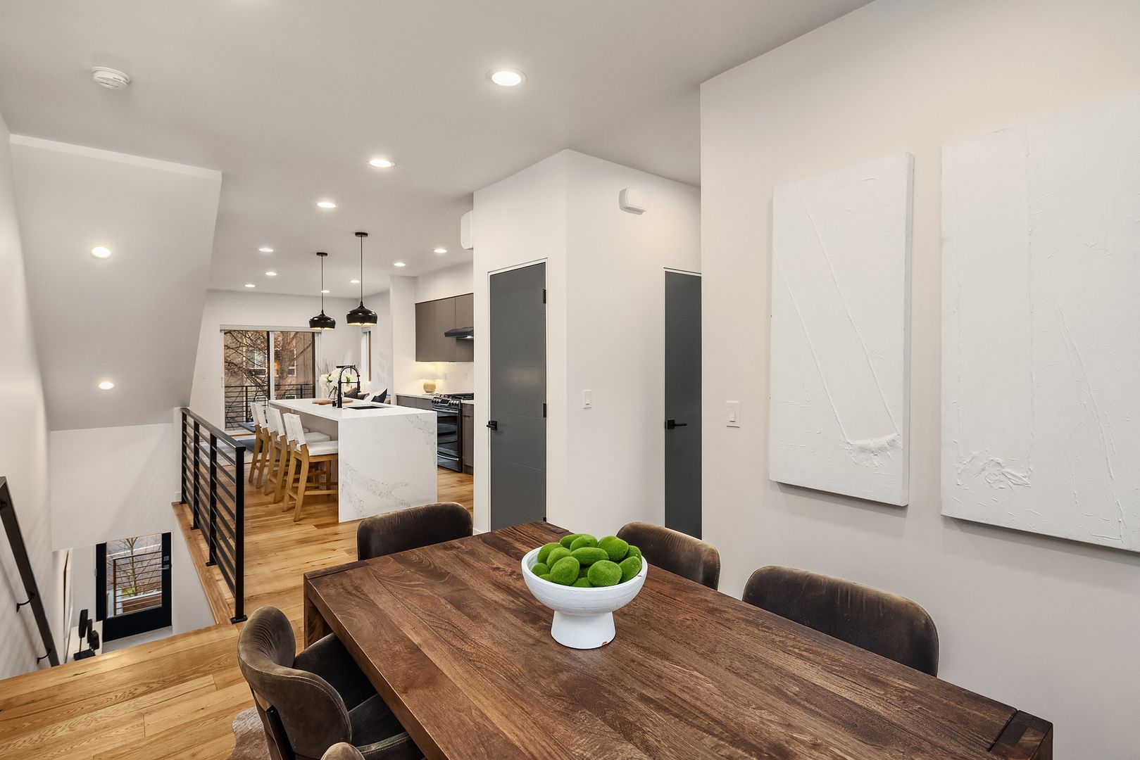 2 bedrooms and 2.5 bathrooms. Bright and inviting, the open-concept layout is centered around a spacious kitchen island with seating, complemented by quartz countertops, a gas range, and abundant natural light from oversized windows. A stylish powder room on the main level adds both convenience and a touch of sophistication for guests.