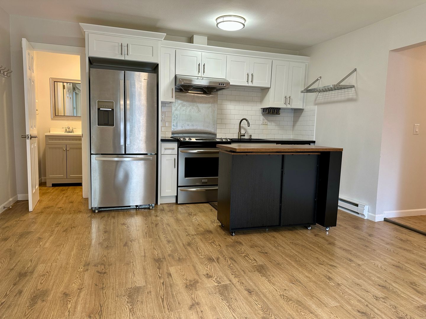 The open concept living room and kitchen feature a half bathroom and updates throughout.