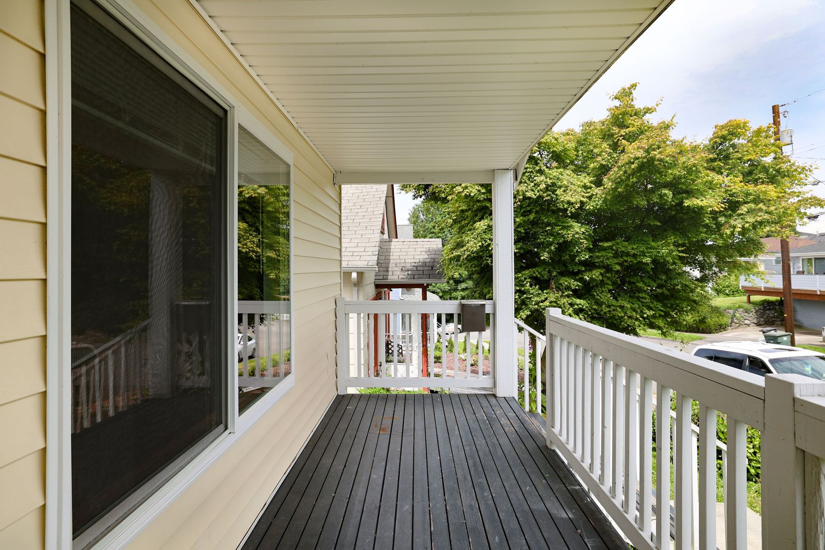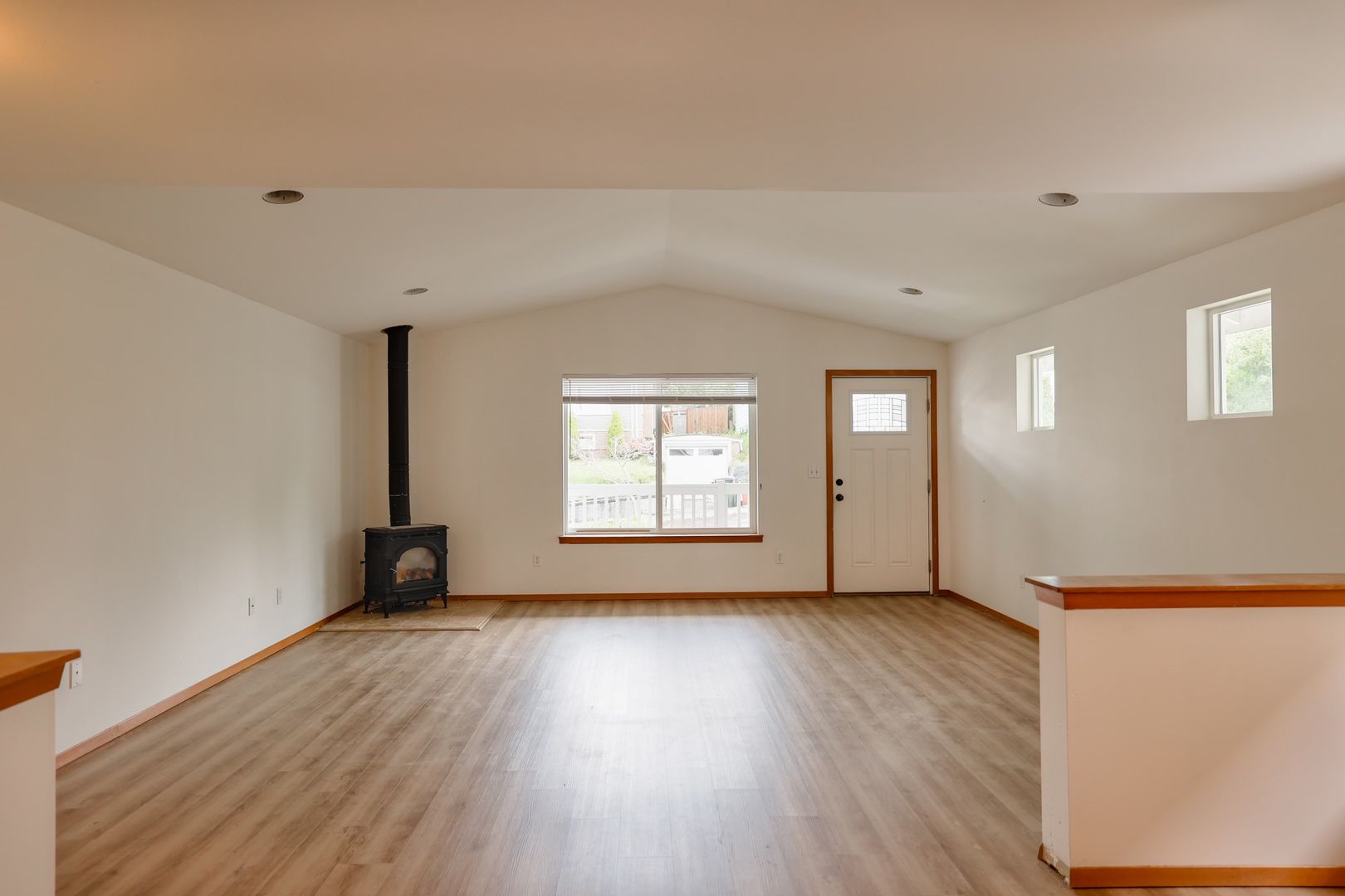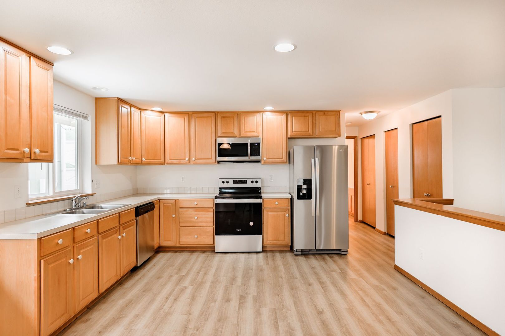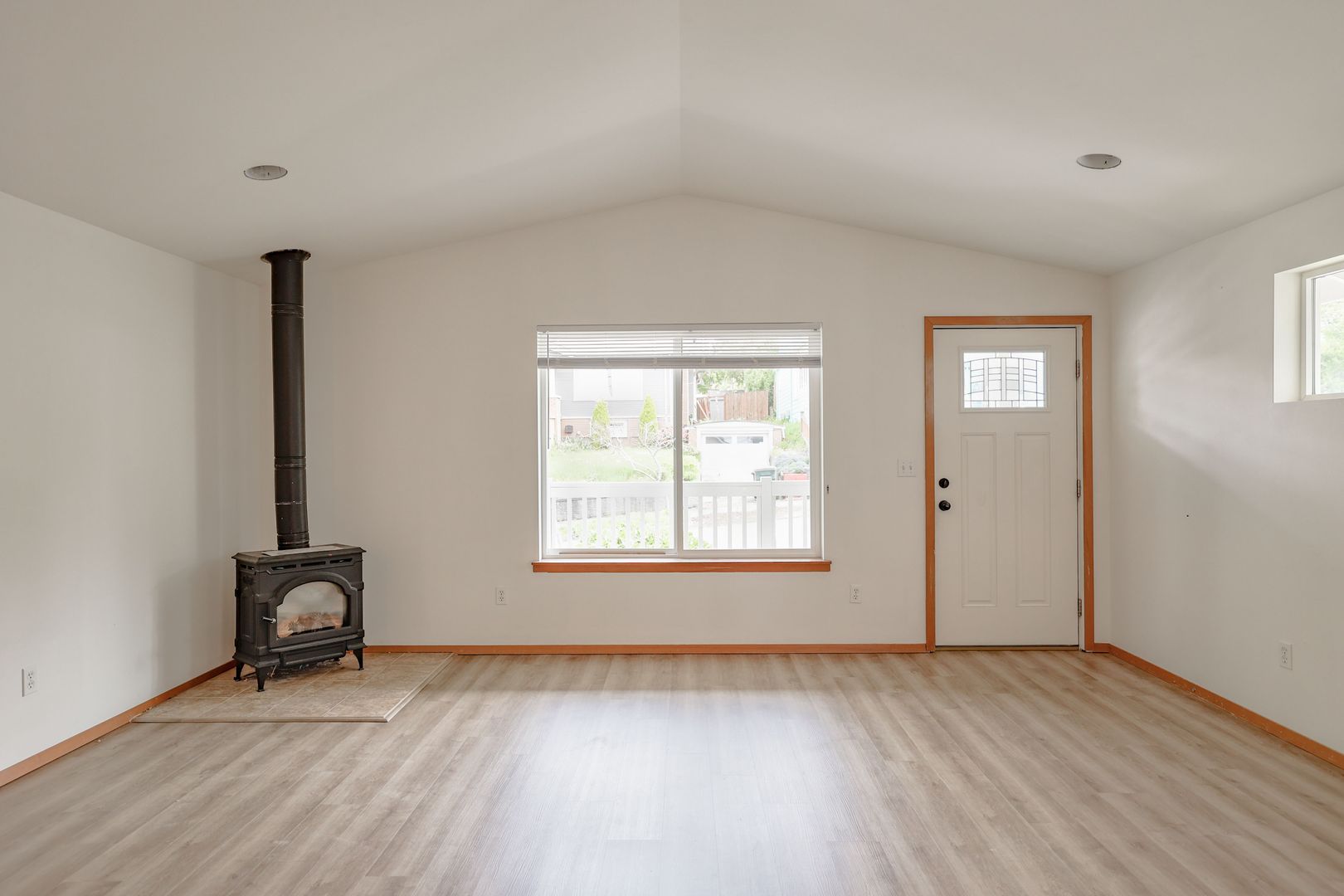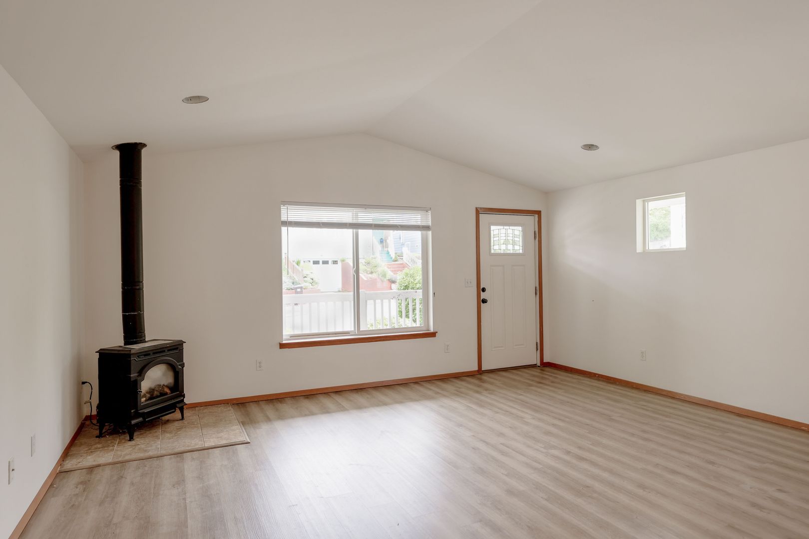 Large living room open to kitchen. Home features LVP flooring throughout, with some carpet. Newer fridge, microwave, and stove. Stainless kitchen appliances. Two full bathrooms, one on each level. Main level features large bedroom, two smaller bedrooms on lower level. Parking for two cars behind house. Street parking available.