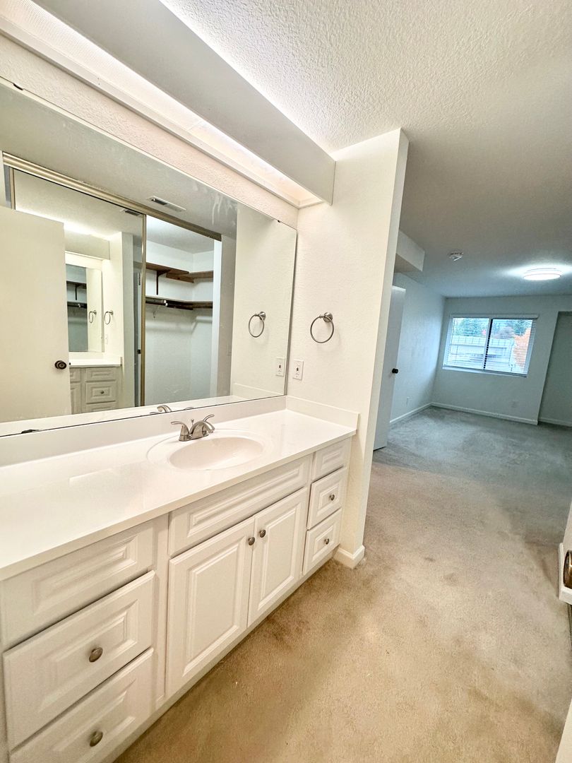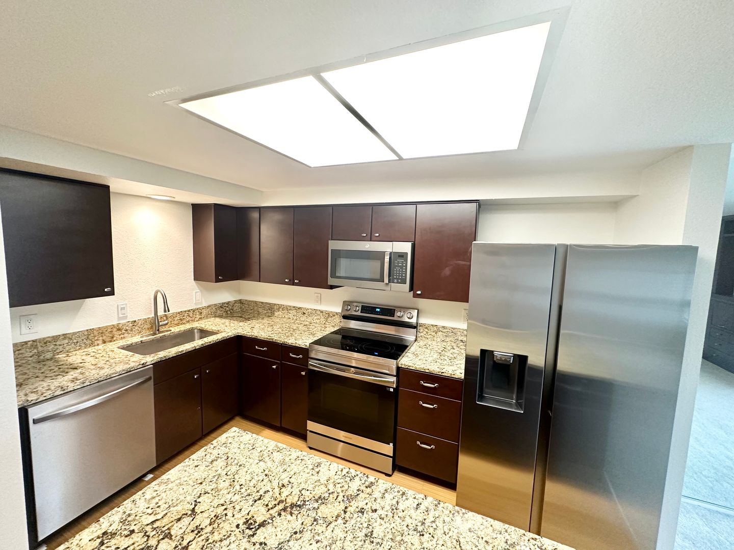 Freshly painted and filled with natural light from large windows, this spacious home features a large primary suite, new stainless steel appliances, and an in-unit washer and dryer for ultimate convenience. A built-in desk with bookshelves provides the perfect spot for working from home or staying organized.