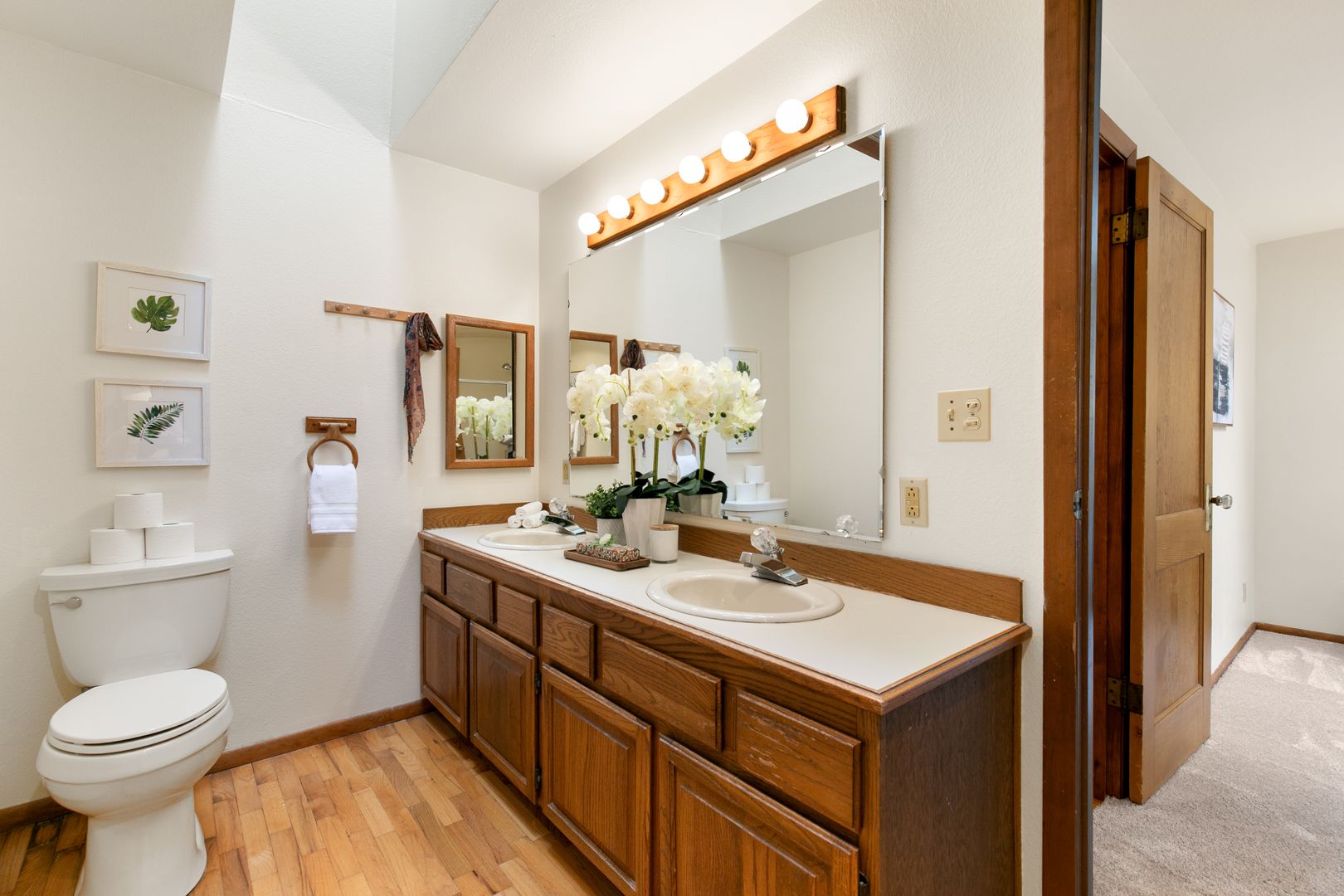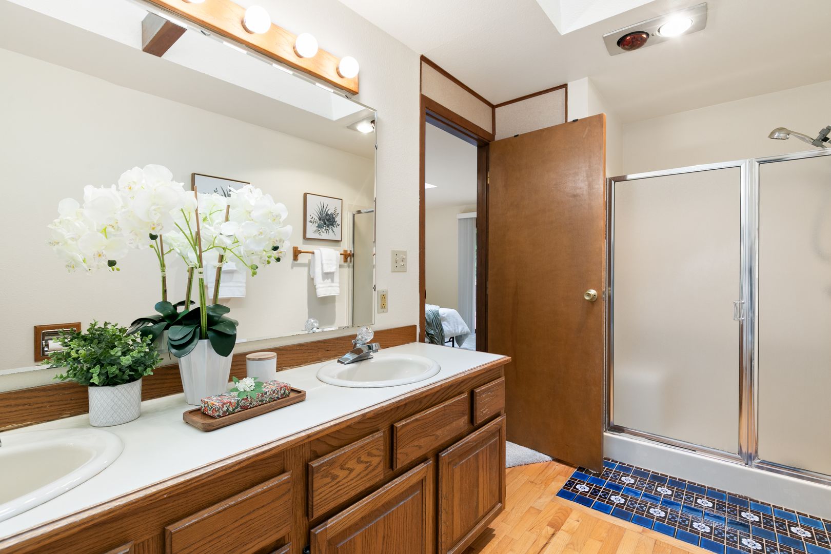 The light-filled kitchen features skylights, custom tile accents, hardwood floors and plenty of space to cook and entertain. The bathrooms include custom tile detailing and a skylight in the primary bath for a spa-like feel. The home’s large windows and additional skylights provide an abundance of natural light.