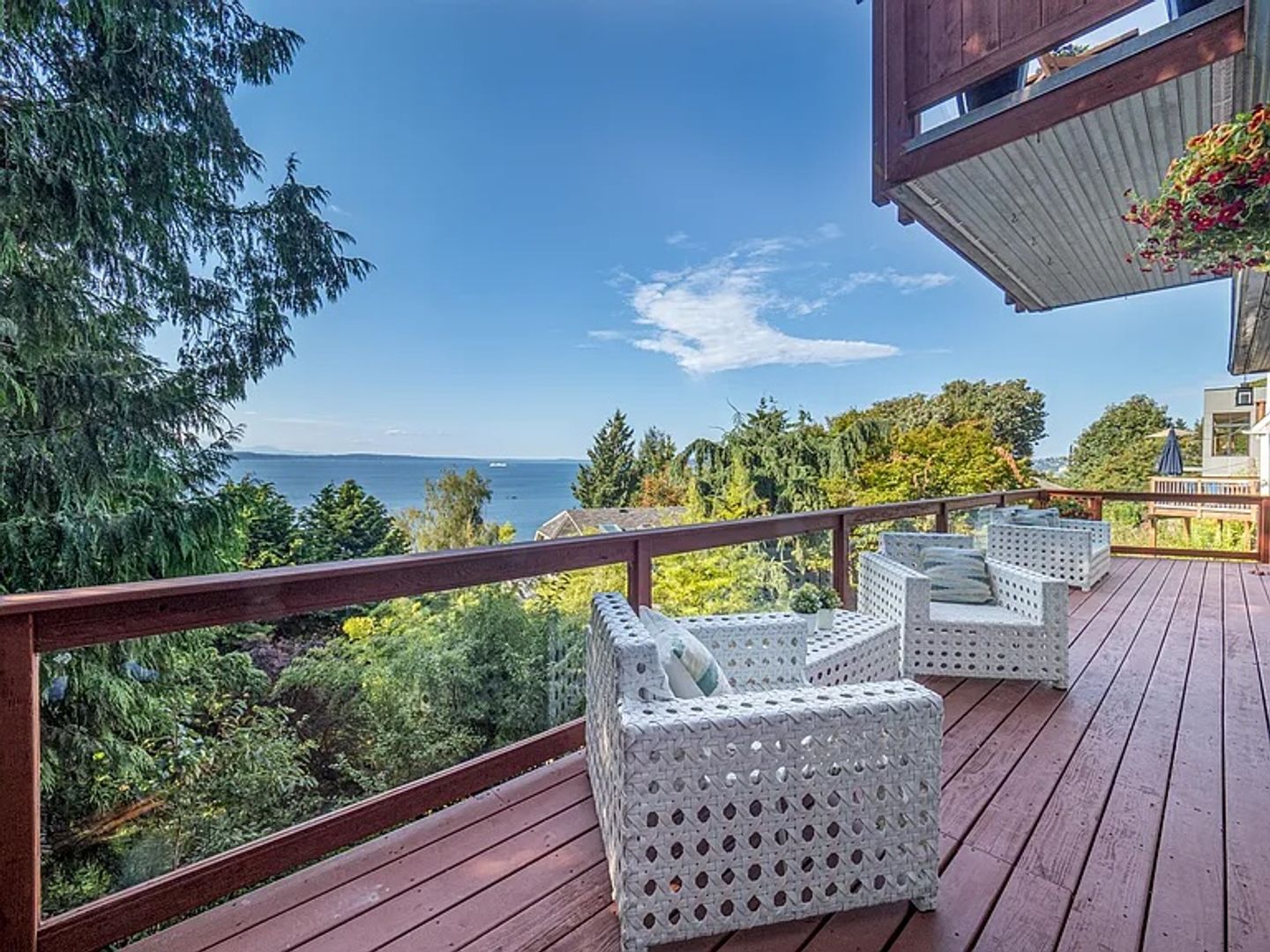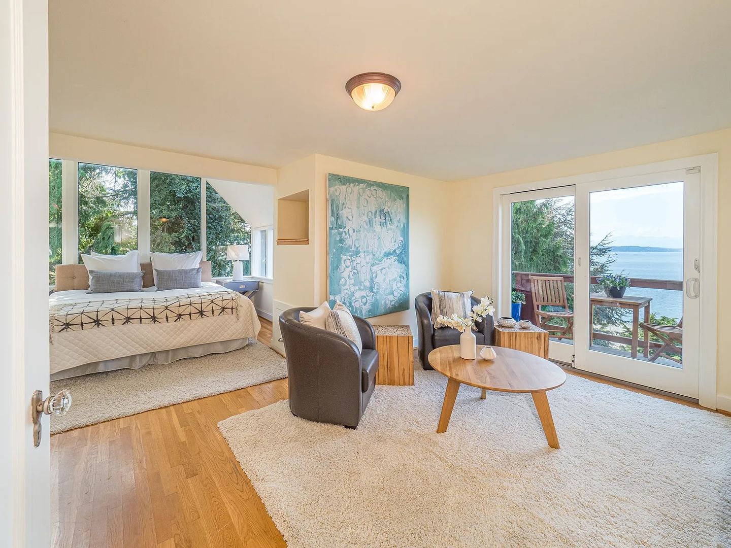 Open-concept living and a chef’s kitchen flow seamlessly into light-filled day rooms and an expansive view deck, luring guests outdoors to soak in sweeping vistas of Puget Sound, ferries gliding by, marine life, and the majestic Olympic Range. The tranquil primary suite offers a sun-drenched sitting room with floor-to-ceiling windows and a private balcony—perfect for early morning coffee above the Sound.