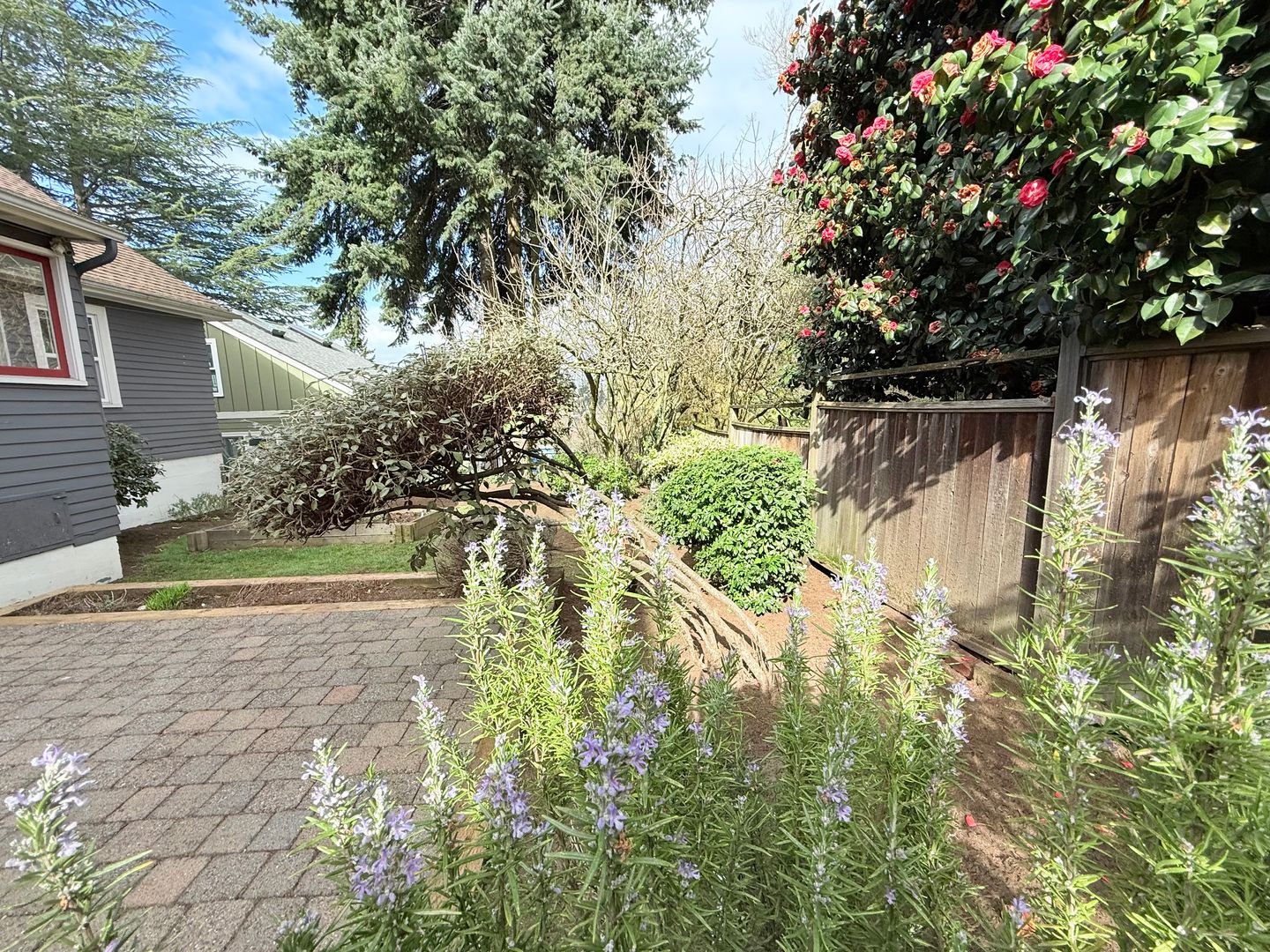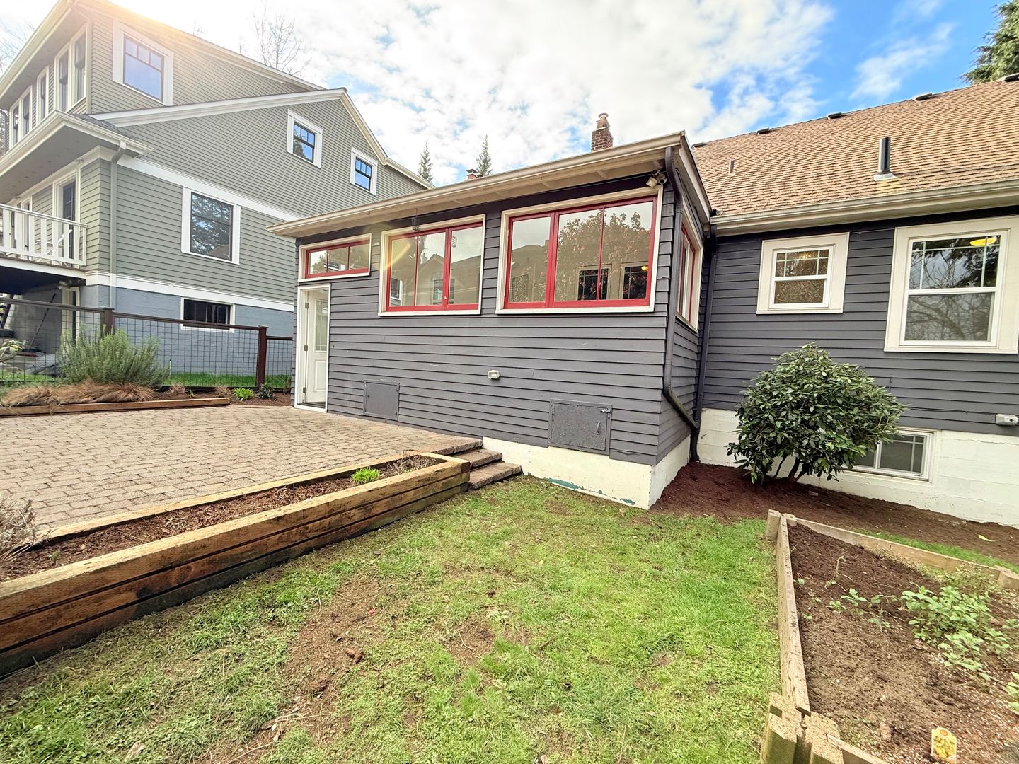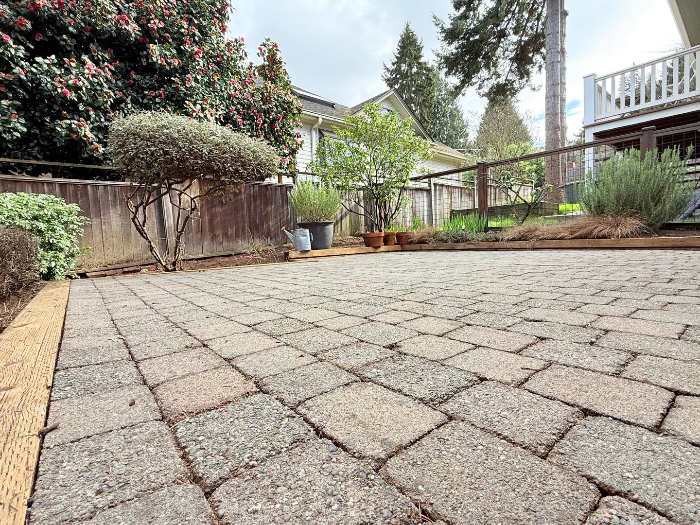 Fenced yard with a raised garden bed invites summer gardening, outdoor dining on the beautiful brick patio, and quiet relaxation. Mature trees and plantings. This elevated setting provides a sense of privacy and charm.