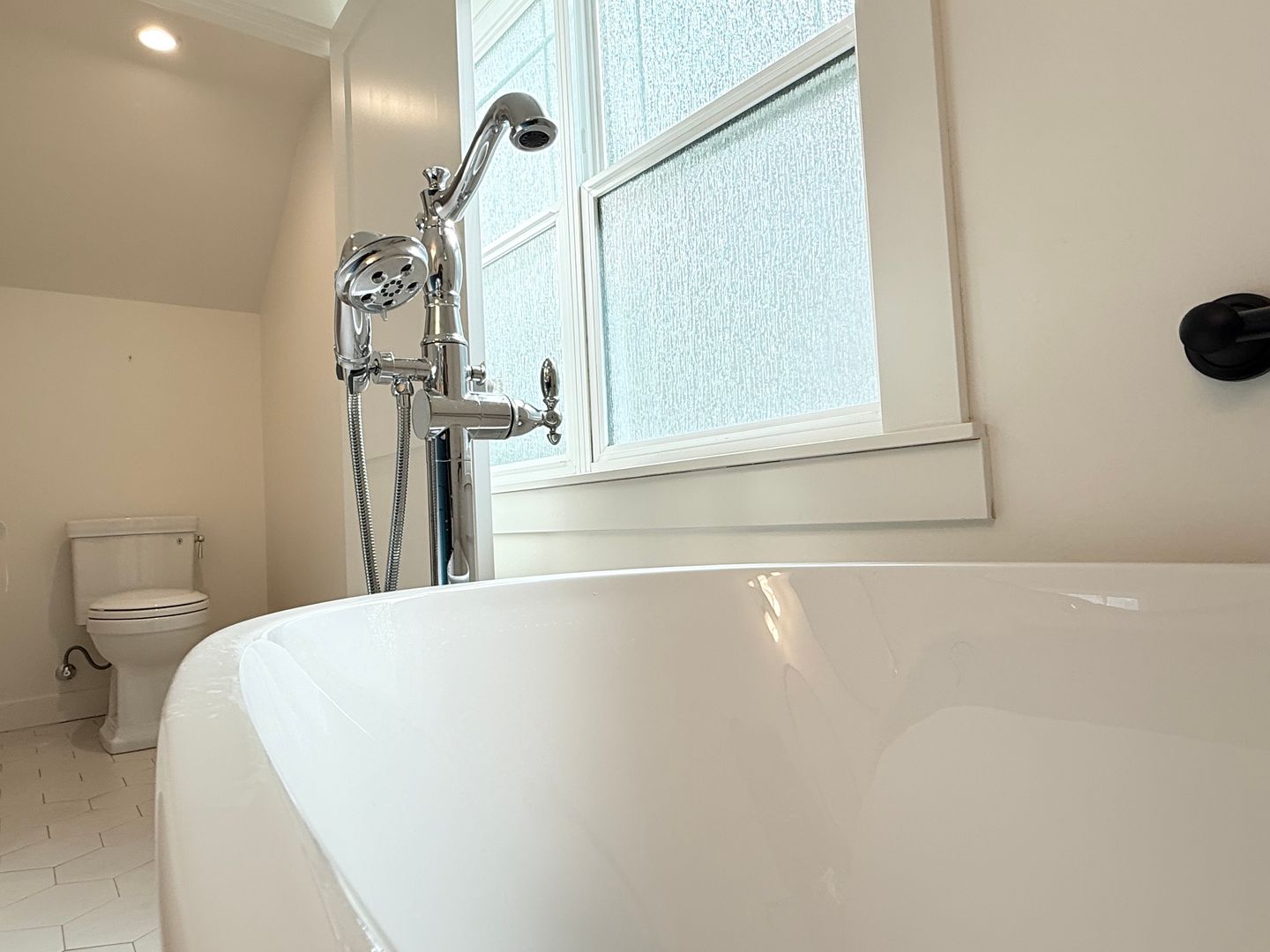 A large freestanding soaking tub perfect for unwinding