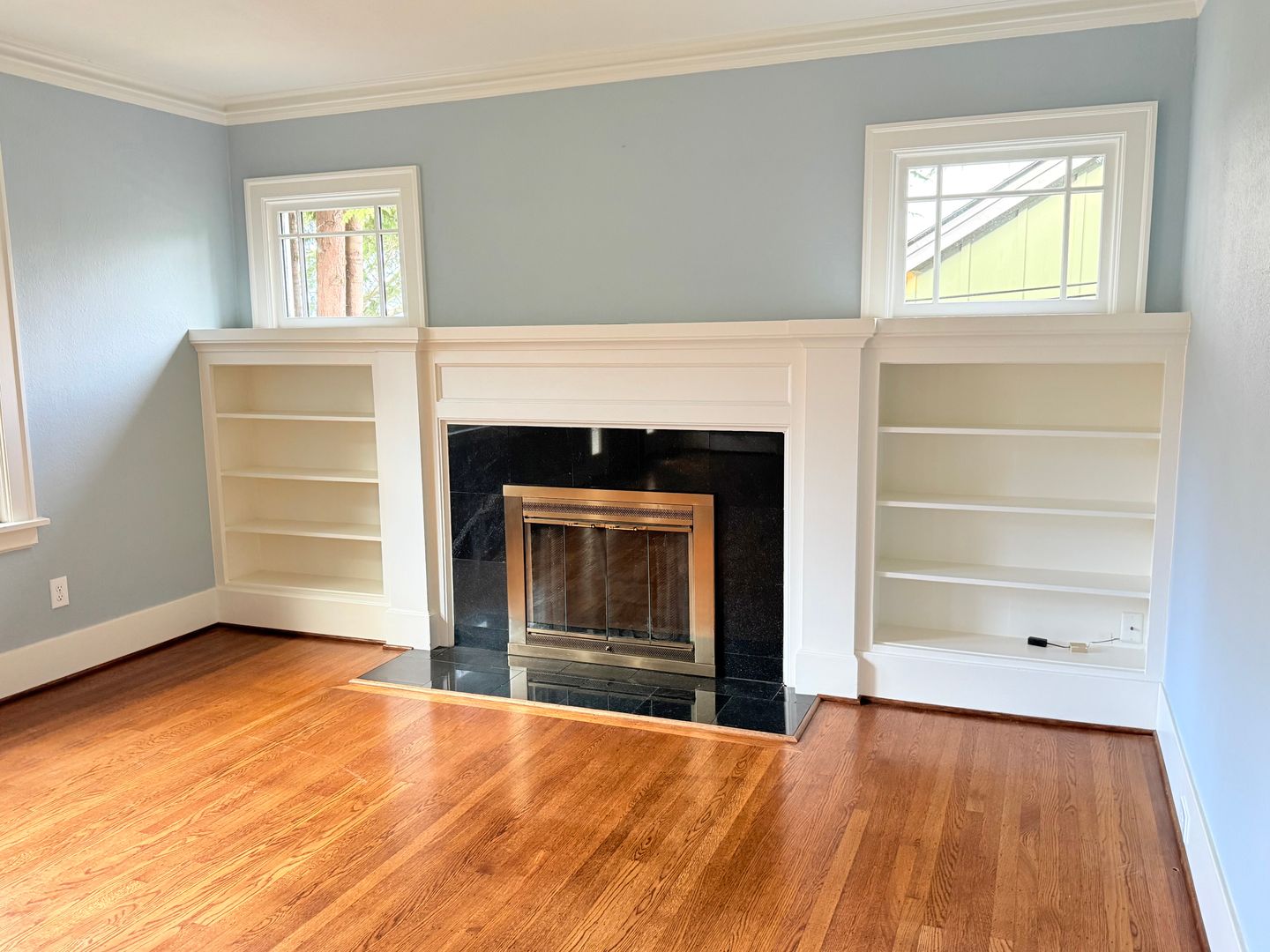 Expansive living room features a classic wood‑burning fireplace and abundant natural light.